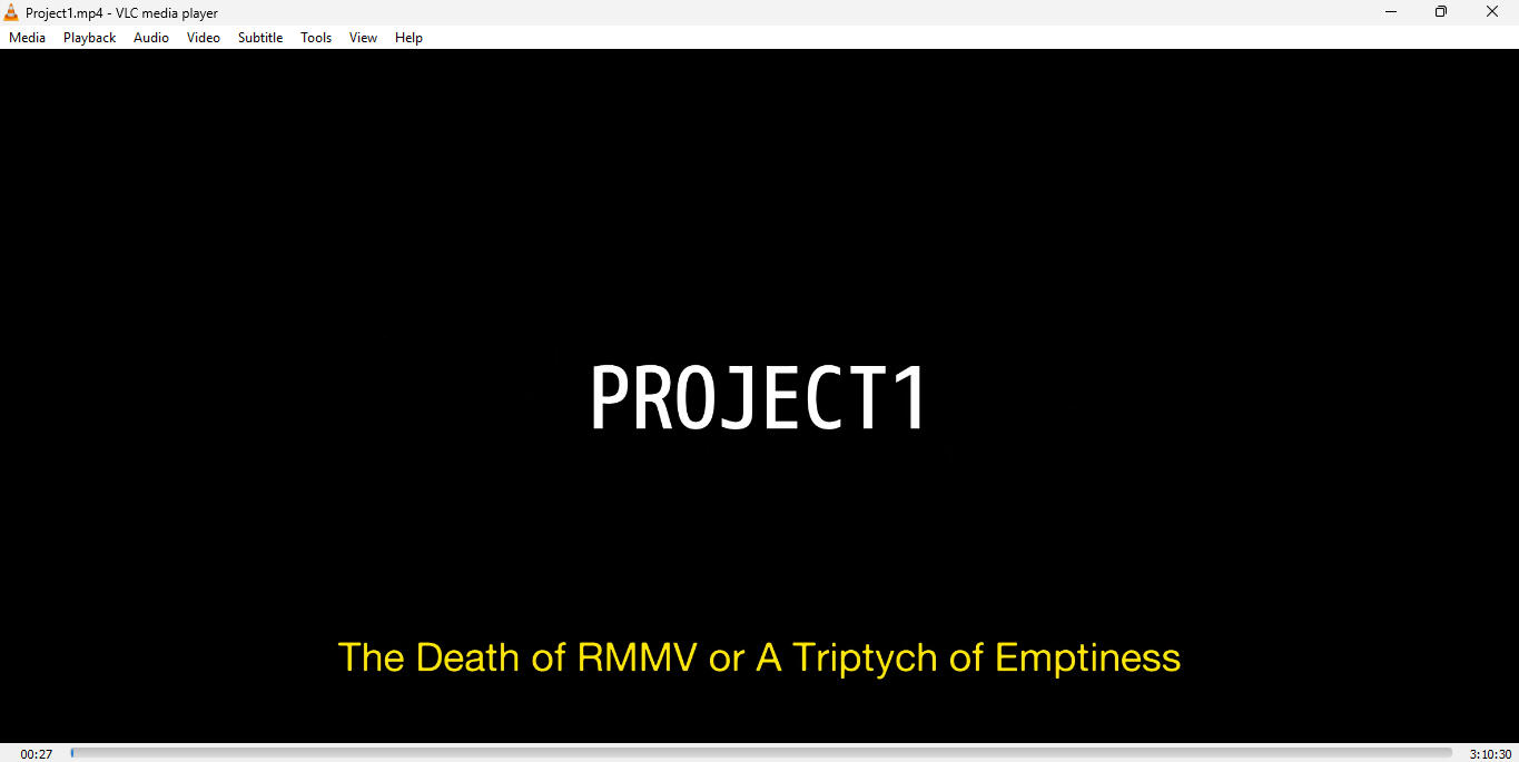 Project1: The Death of RMMV or A Triptych of Emptiness is a three-hour "triptych" non-narrative experimental animated feature about "emptiness", indicates being nothing but the lack of environment and absence of population. The film is divided into three segments with different film formats in reverse chronological order:
